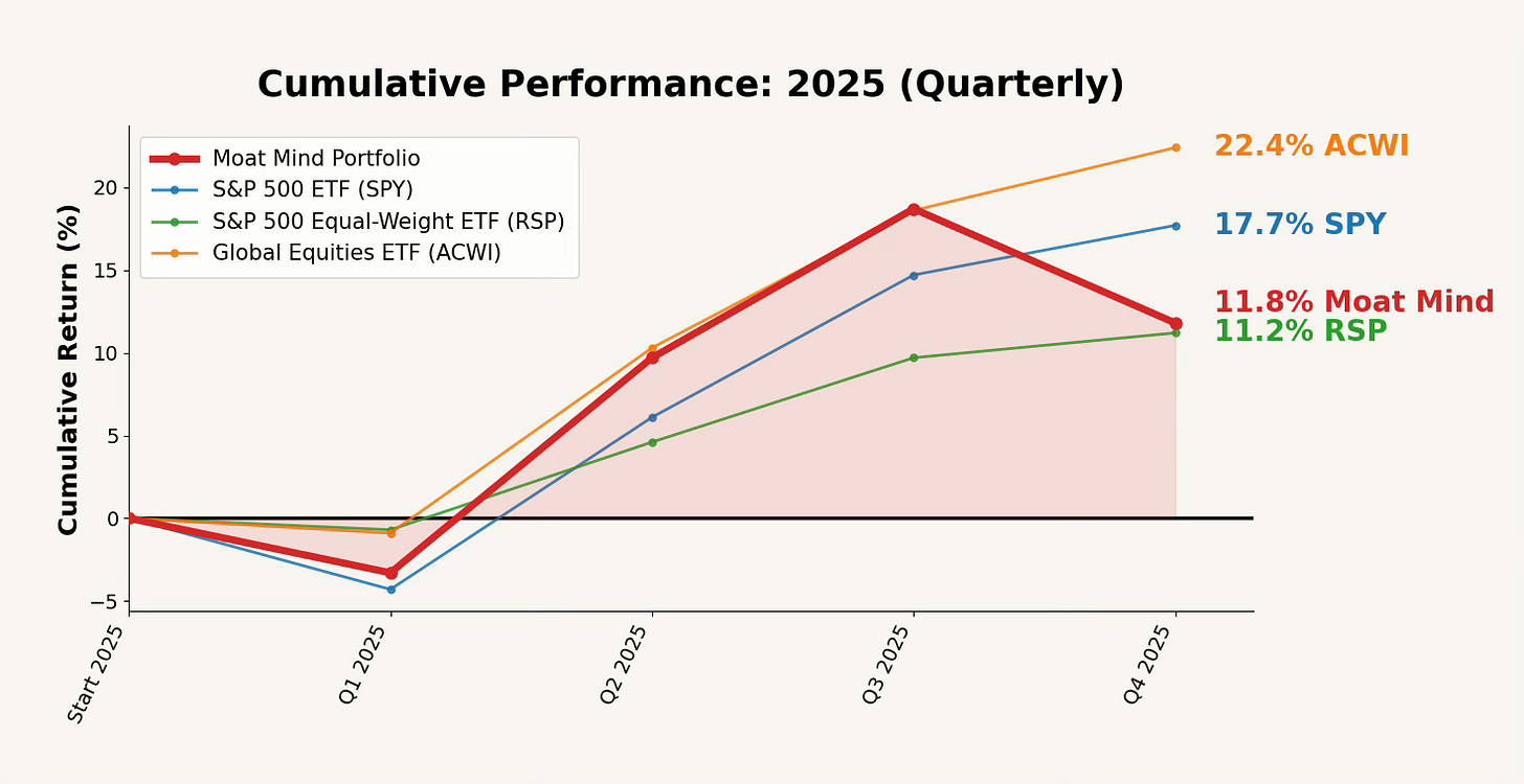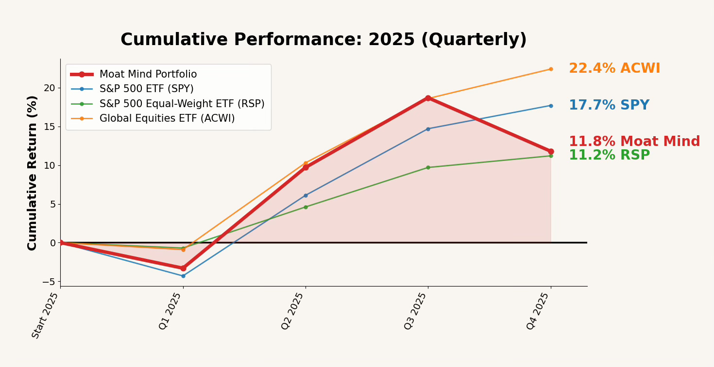 The Moat Mind Portfolio finished 2025 up 11.8%. That’s a positive absolute year, but it trailed global equities (ACWI) and the S&P 500 (SPY), while landing roughly in-line with S&P 500 equal weight (RSP).