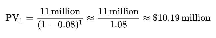 For example, the present value of the Year 1 cash flow of $11 million would be: