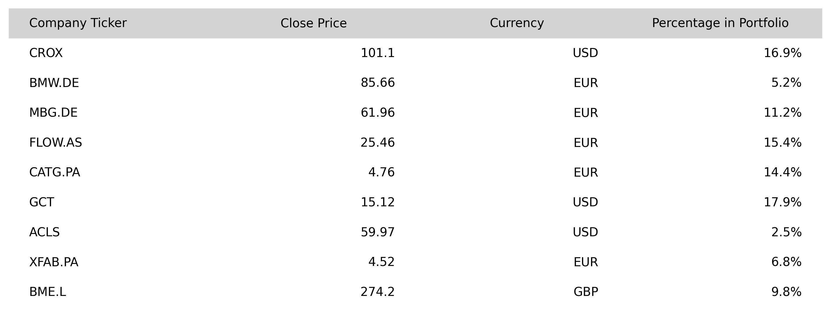 Sharing the portfolio composition after reindexing at the close of March 10th due to addition of B&M European Value Retail (BME.L).