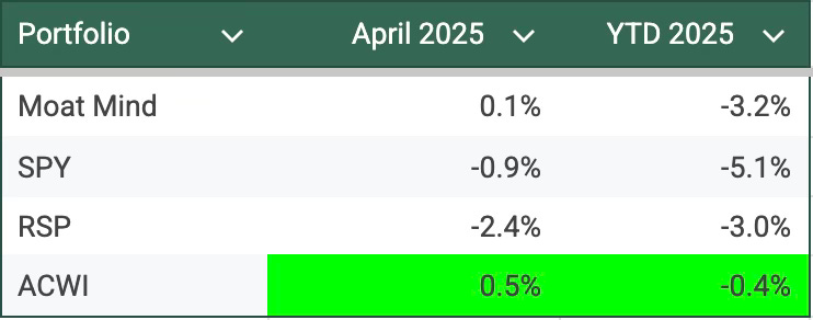 April 2025 was a mixed month for global equities, marked by persistent volatility and divergent performance across regions. The Moat Mind portfolio managed to hold steady with a 0.1% return, outperforming the S&P 500 (SPY) at -0.9% and the equal-weighted RSP at -2.4%, but trailing the global ACWI index, which posted a 0.5% gain.